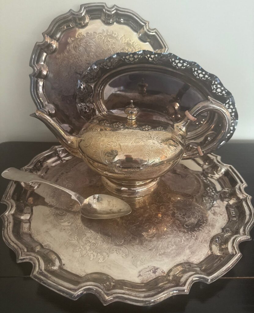 Vintage BIRKS Sterling Teapot w/ EP Silver Trays & Serving Spoon