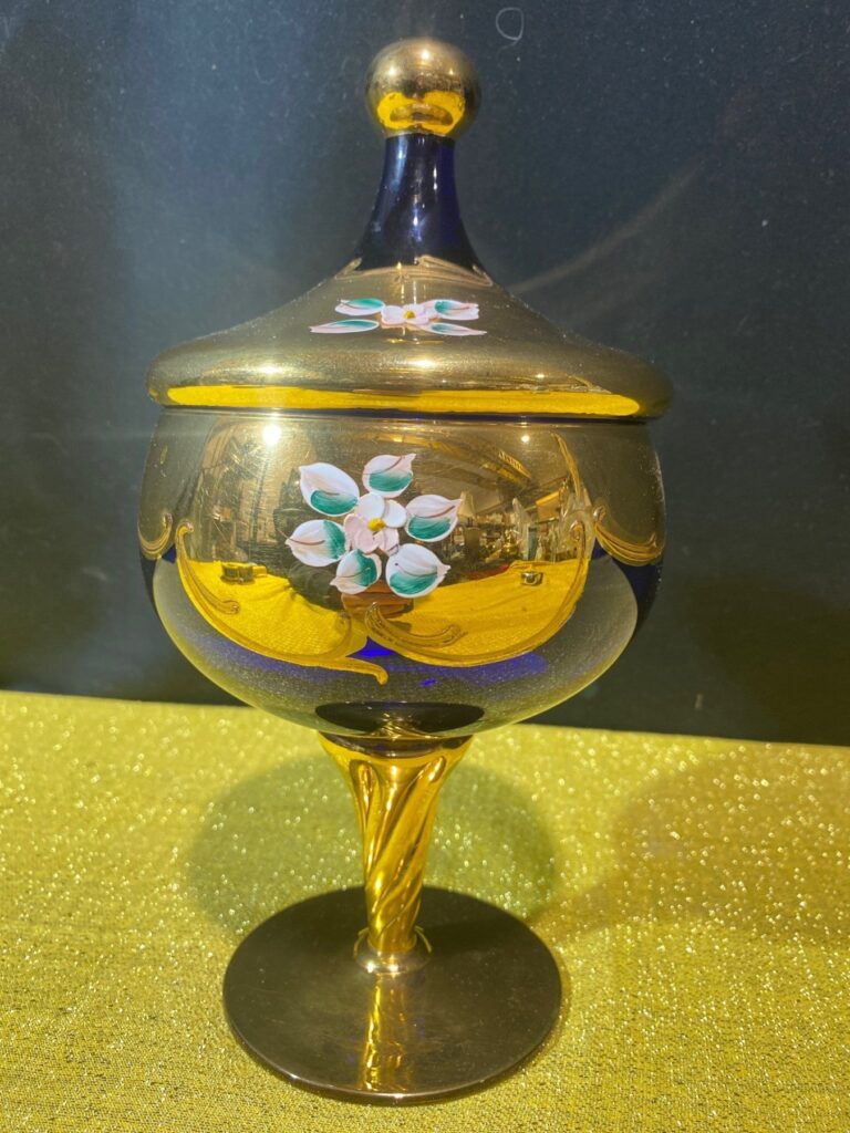 Vintage Czech Bohemian Gold Gilt, Hand Painted Glass Lidded Candy Dish