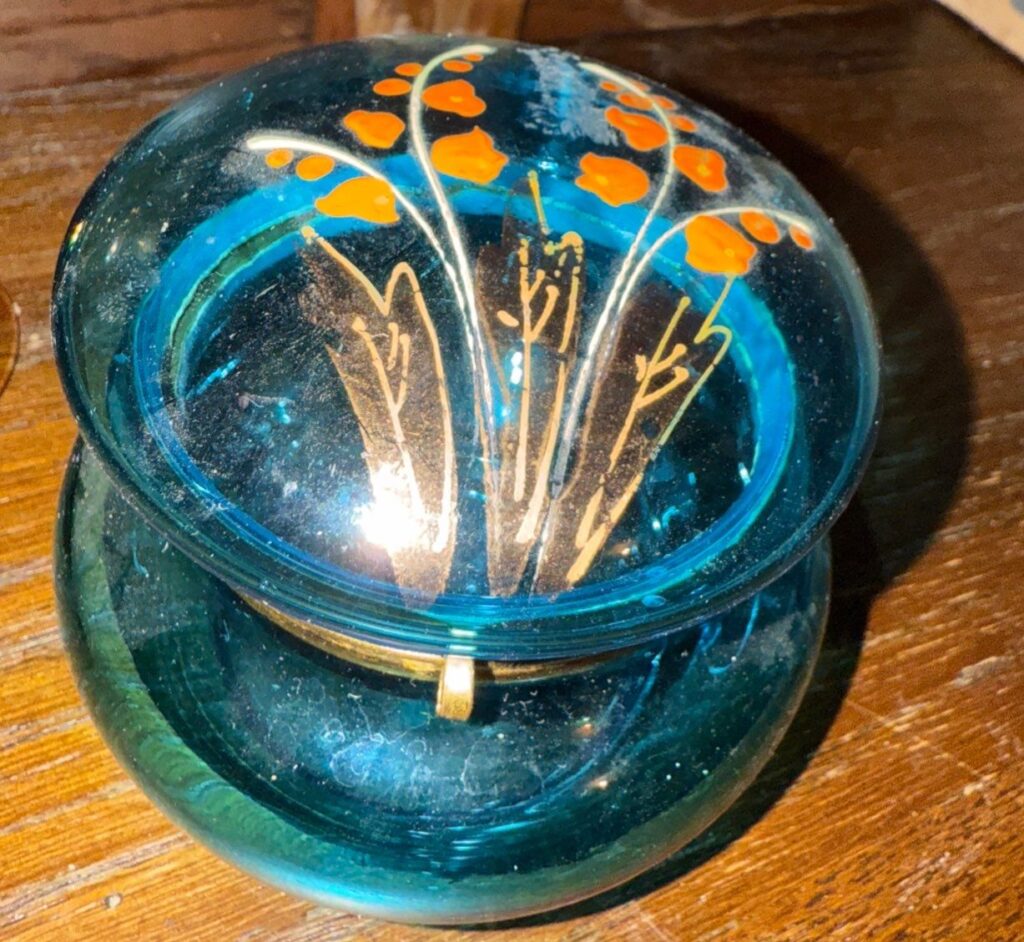 Hand Enameled Blue Bohemian Glass & Brass Clasp Trinket Box